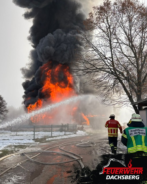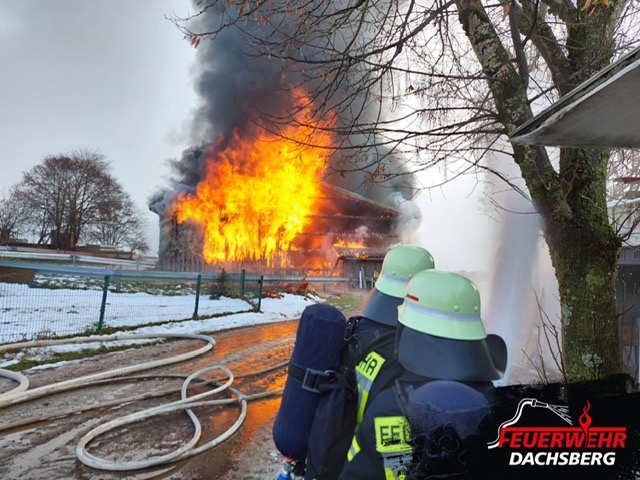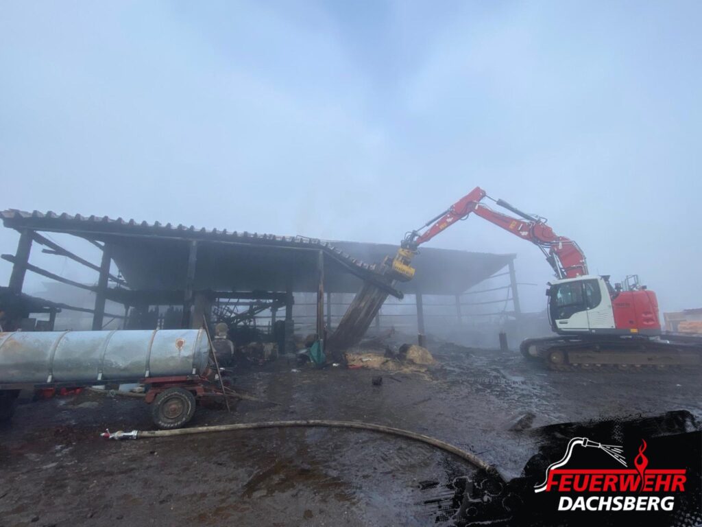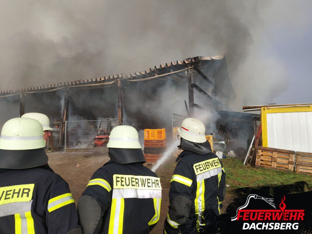 Beim Eintreffen brannte das Gebäude – in dem sich unter anderem landwirtschaftliche Maschinen, ein größerer Dieseltank sowie eine Geflügelhaltung mit rund 4.500 Hühnern befanden – bereits vollständig. Eine Rettung der Tiere war leider nicht mehr möglich.